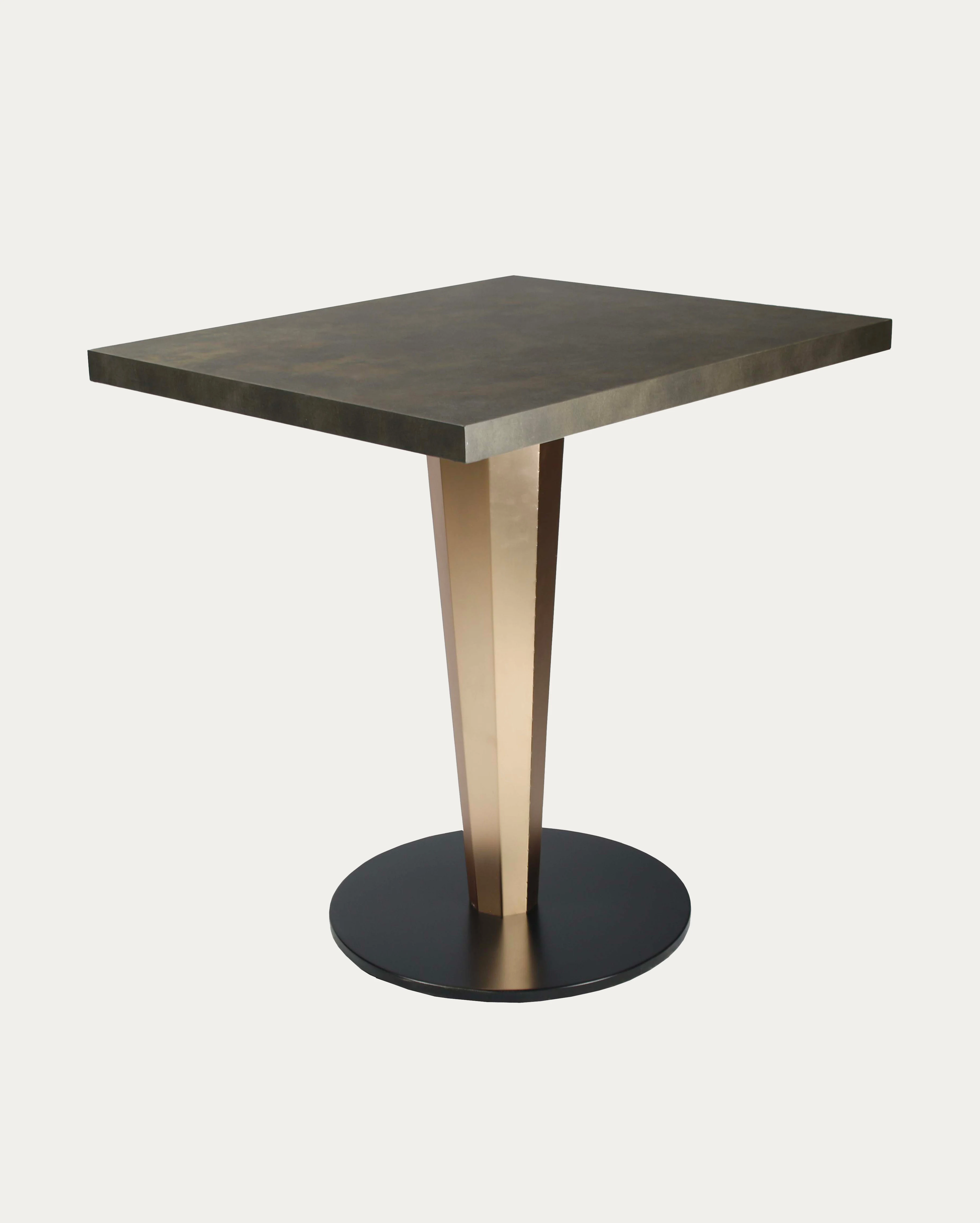 Mesa interior con base de acero y tablero personalizable.